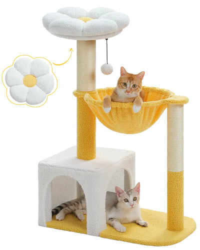 MUTTROS Cute Cat Tree with Flower Top Bed - Cloud Scratching Posts 35" Small Cat Tower with Large Metal Frame Hammock for Indoor Cats White Cat Condo for Kittens Yellow